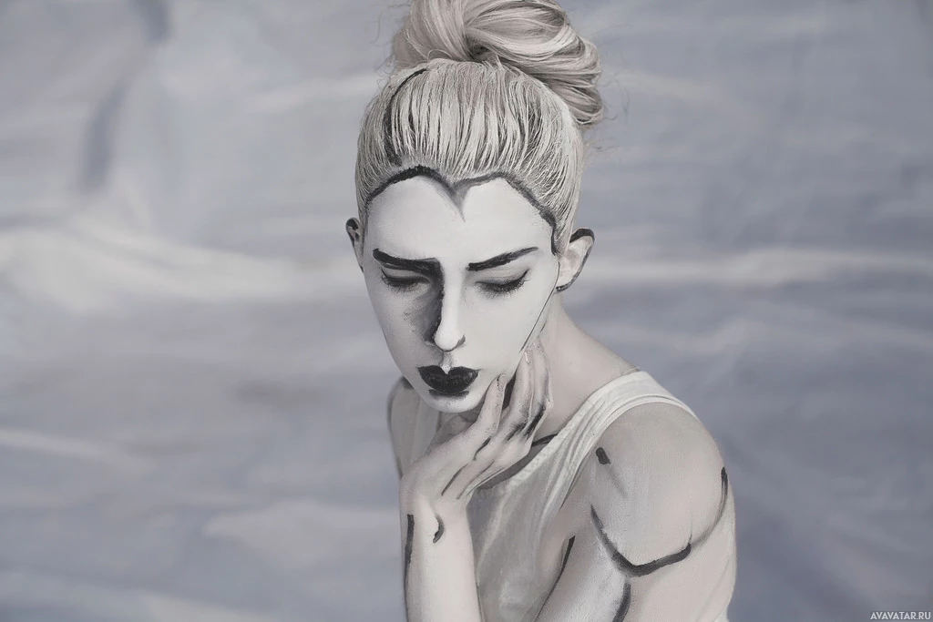 a contemplative expression, gazing off to the side. It's worth noting that this type of body art can be seen as a form of self-expression or a unique fashion choice, but it's essential to respect privacy and