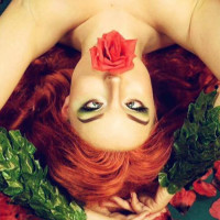 Poison Ivy from comic books and media. They are lying on their back with red rose petals spread out around them, creating an allure that resembles Poison Ivy's