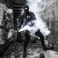 rocky environment. The individual is wearing a jacket with a hood and has their face obscured by smoke. They are holding a canister or device that emits
