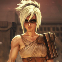 The image features a female character, likely from a video game or animated series. She has blonde hair and is depicted wearing armor with a sword in her hand. She is set against a background that suggests an ancient or fantasy setting.