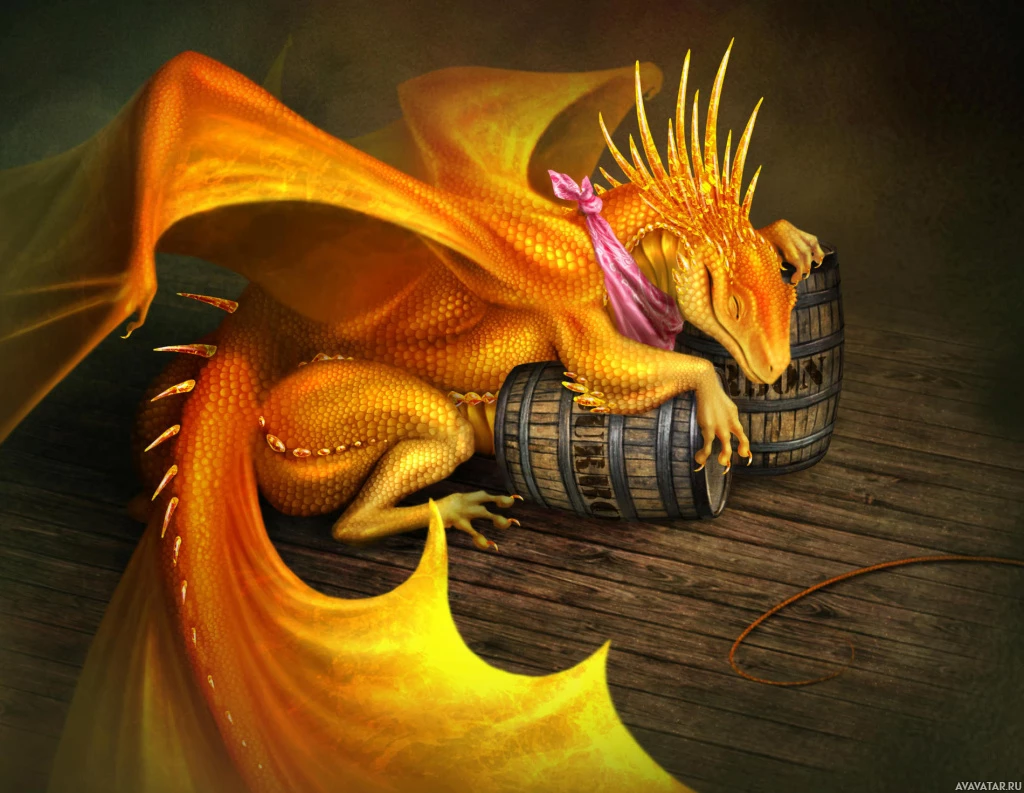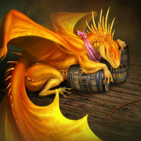 a fantasy scene featuring an orange dragon with yellow spikes, resting on top of a wooden barrel. The dragon appears to be wearing
