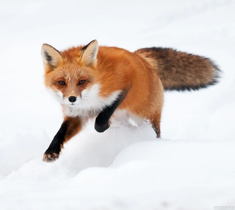 На картинке изображена красная лиса в снежной местности. Лиса, кажется, бежит с хлопающими ушами, вероятно, из-за движения. Он установлен на фоне белого снега, что свидетельствует о зимних условиях.