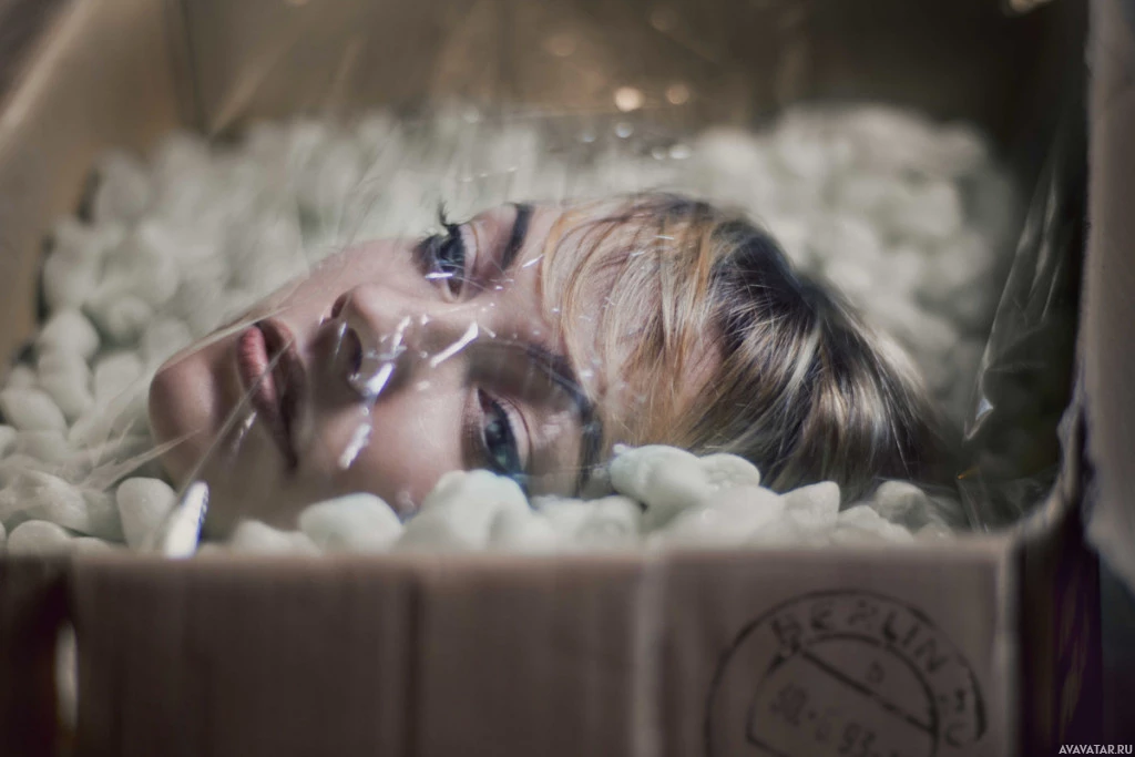 packaging materials, possibly bubble wrap or styrofoam peanuts. The individual's head is sticking out from the top of the container, and it looks like they are either resting on the ground or in a box. The scene is surreal and artistic, with