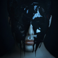The image shows a person with their head and upper torso visible. The individual's face appears to be partially obscured by black, textured paint or some other kind of dark substance, possibly representing a mask or an artistic expression. There is no visible men's clothing or any indication of gender in the image provided.