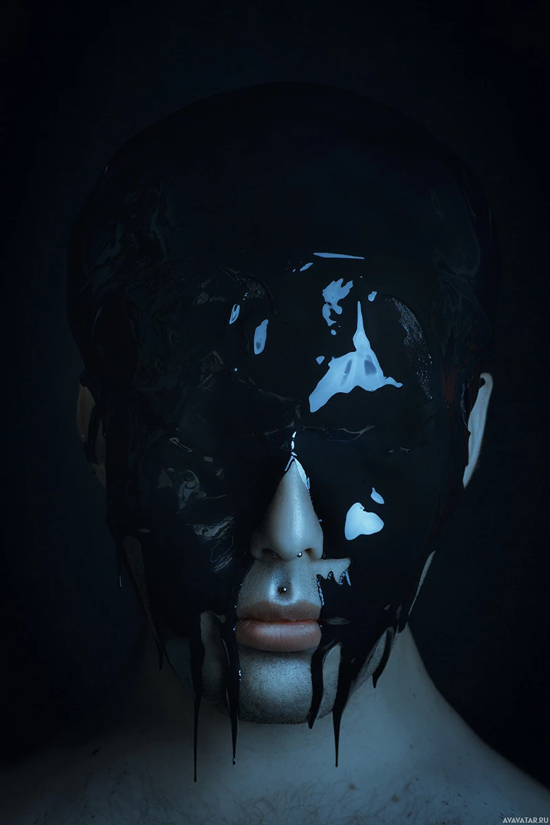 Картинка показывает человека с видимой головой и верхним туловищем. Лицо человека, по-видимому, частично затенено черной текстурированной краской или какой-либо другой темной субстанцией, возможно, представляющей маску или художественное выражение. На представленном изображении нет видимой мужской одежды или каких-либо указаний пола.