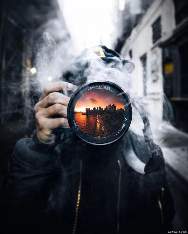 The image shows a person holding up a camera with smoke around it. It appears to be taken at night, as indicated by