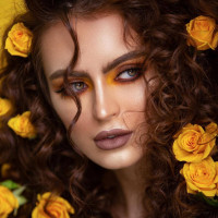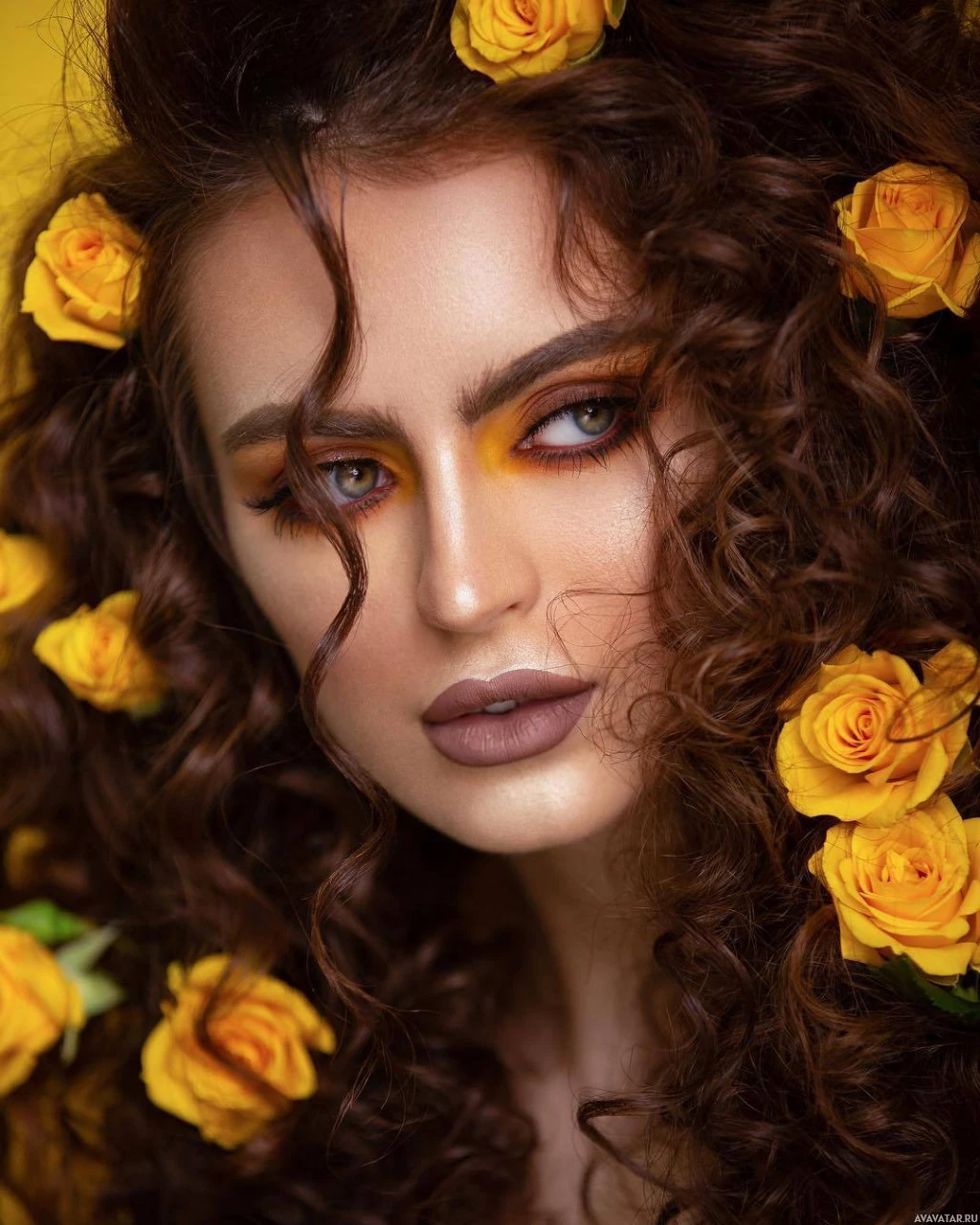 The picture features a woman with curly hair and makeup. She is wearing yellow flowers in her hair, which could be roses or another type of flower. Her eyes are looking to the side, and she has a contemplative expression on her face.