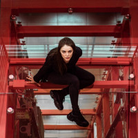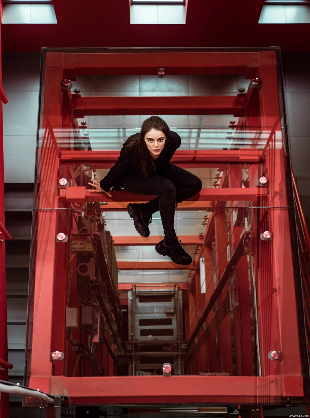 everyday wear. The setting looks like it could be part of an industrial or urban environment, given the design of the elevator and the red color scheme.