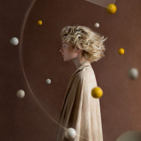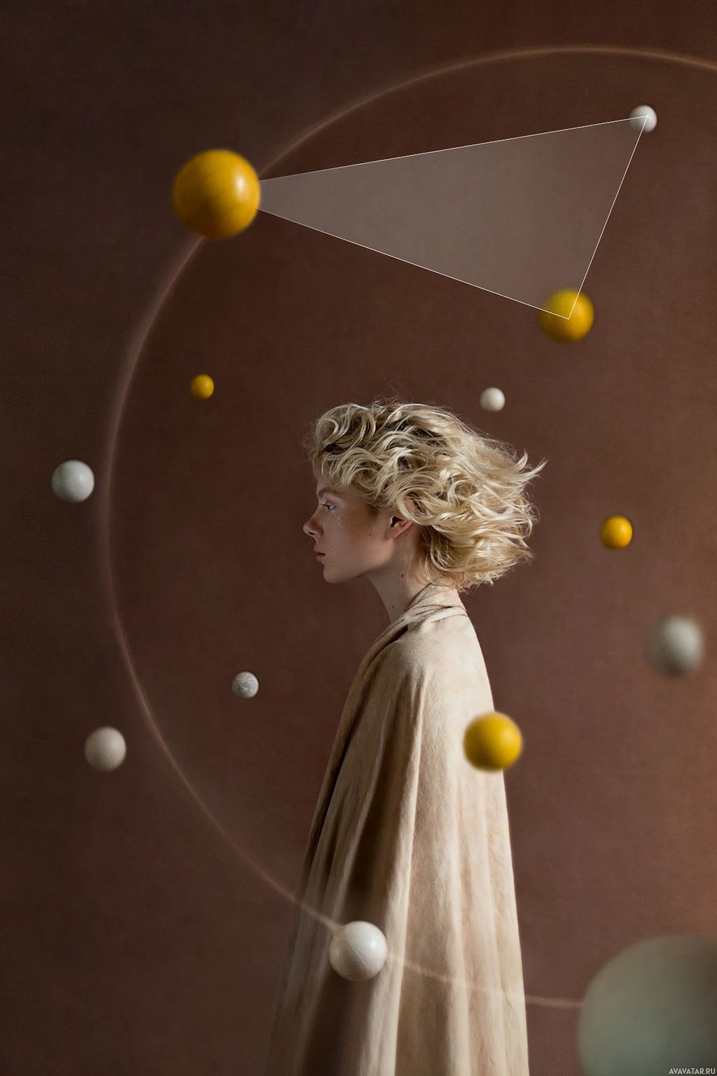 a circular pattern resembling a planetary system or an astronomical chart surrounding the individual's head. The person appears to be gazing off into the distance, possibly contemplating