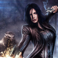 a brunette woman holding a pistol with one hand while the other hand is outstretched, seemingly pointing. Her attire and pose suggest she could be part of