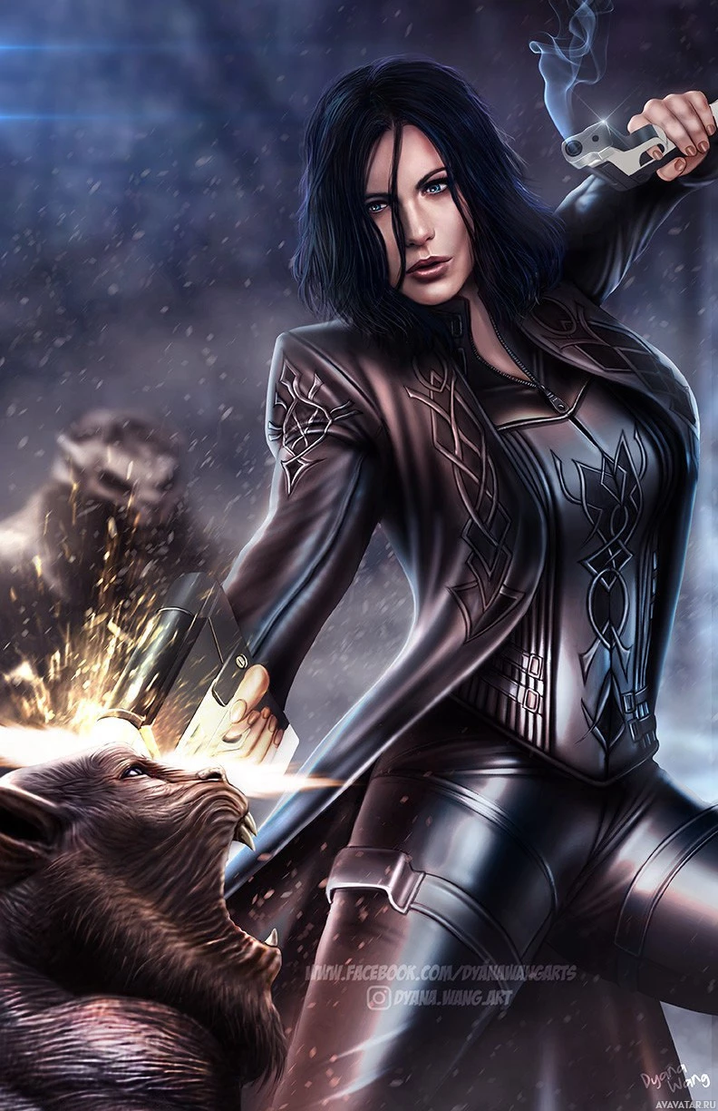 an action scene. There is also an animal that resembles a hyena in the background, which adds to the dynamic and intense atmosphere of the image. The character's expression and body language convey