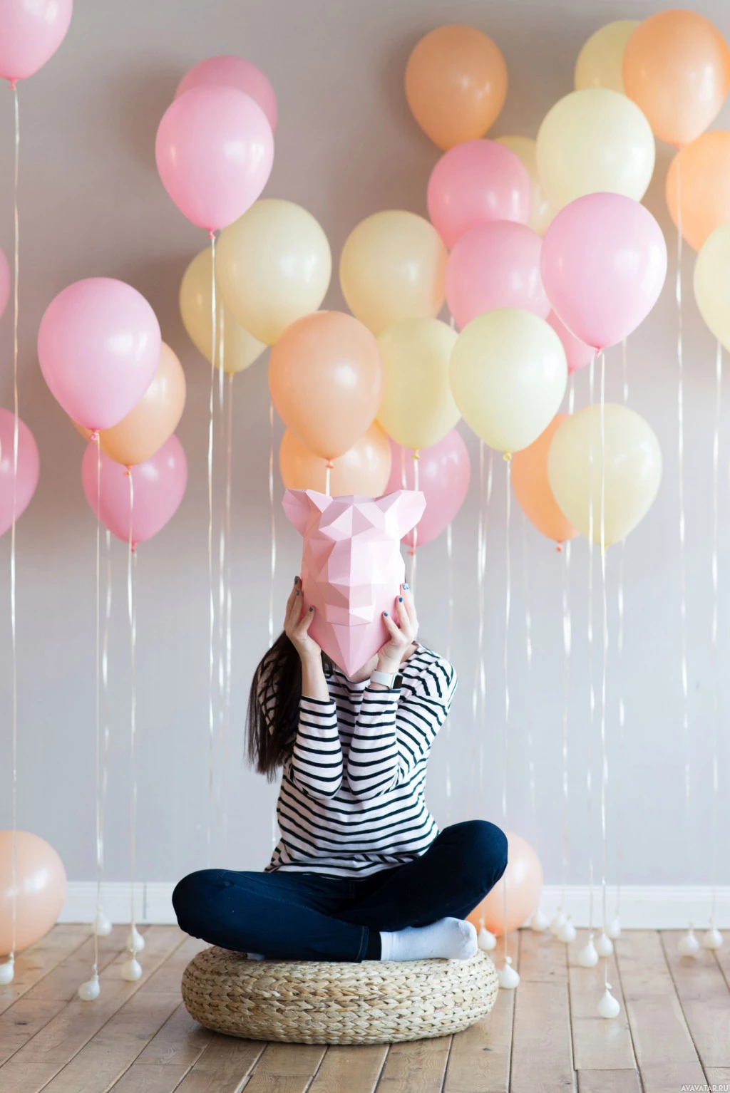 playful imagination. Behind them is a wall adorned with multiple pink and yellow balloons attached by strings, creating an effect that resembles