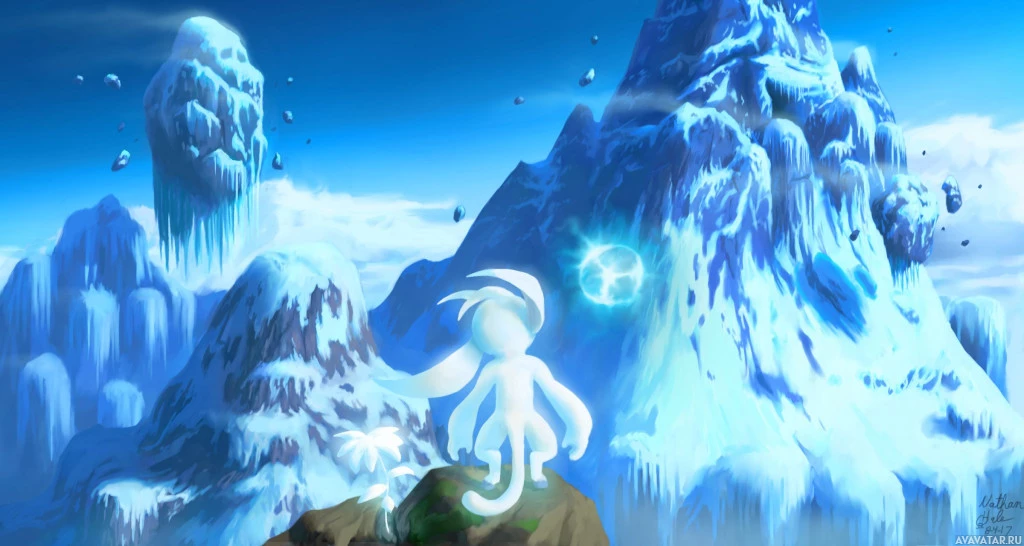 a grassy area surrounded by ice and snow. Behind this character are majestic