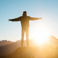 the peak of a mountain. He is with his arms raised, embracing the sunlight and