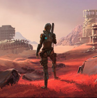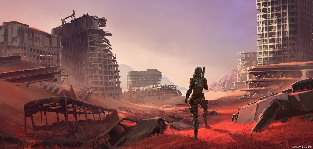 a post-apocalyptic scene with a character standing in the foreground. Behind this character are ruins and rubble, indicative of destruction and decay. In the distance, there appears to be some
