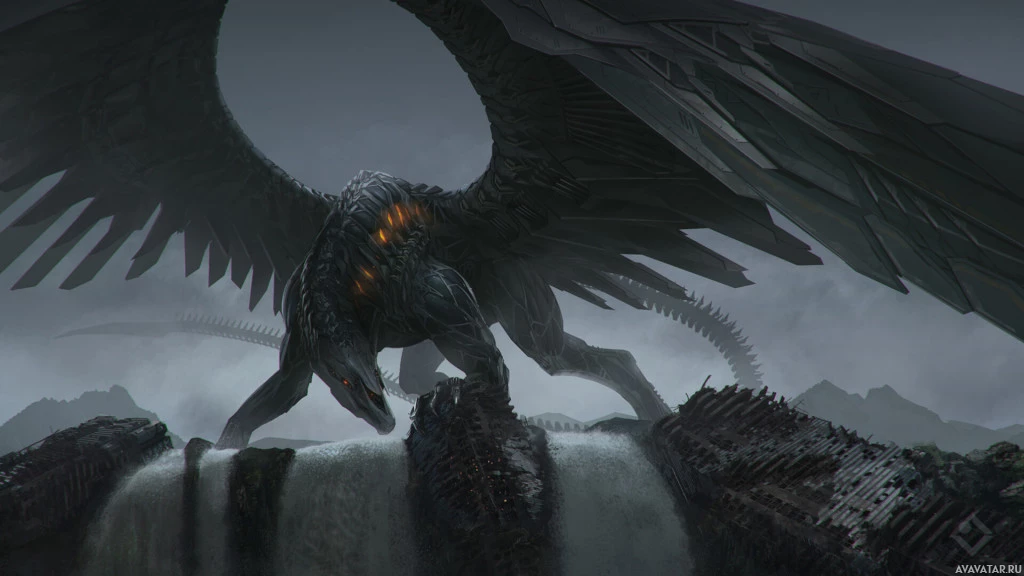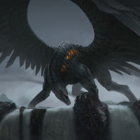 a rocky outcrop or island. The creature has an imposing presence, with detailed feathers that suggest it might be from a mythological or