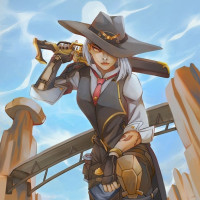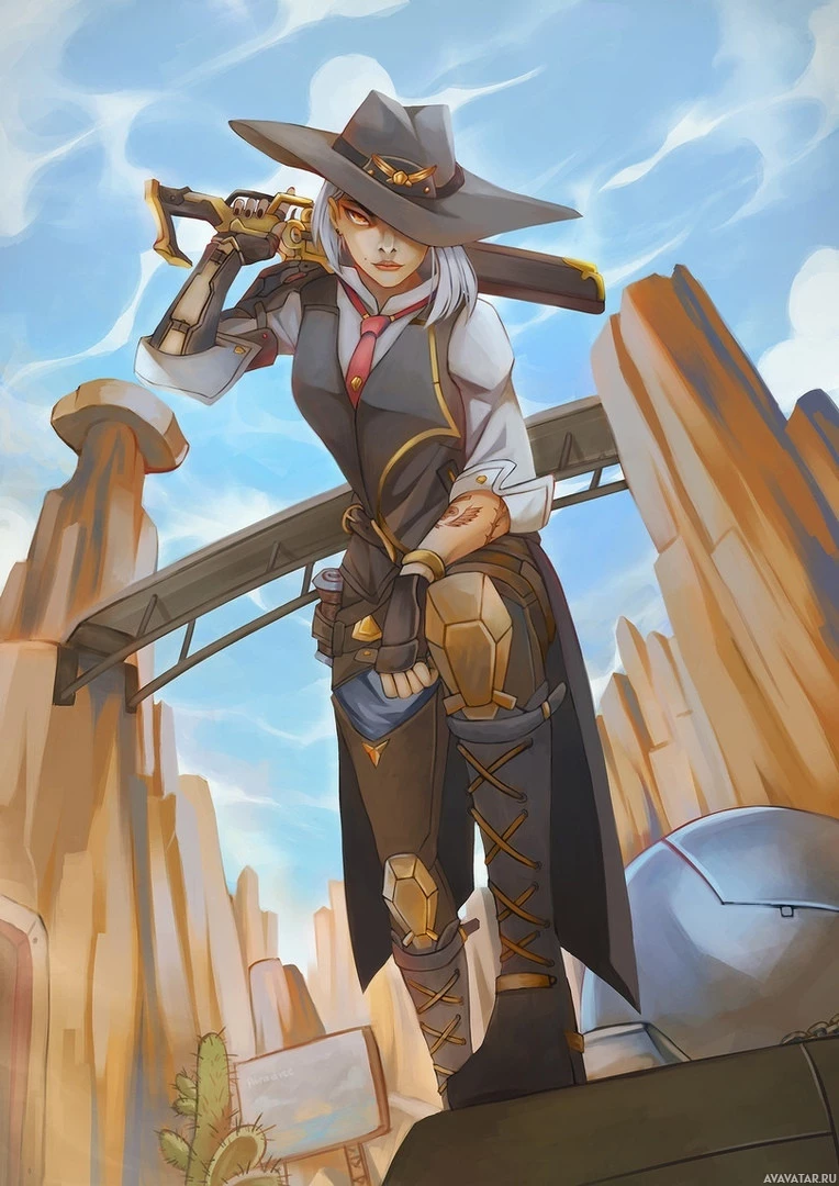 a cowboy hat and a bandana over her mouth. Ashe is holding a gun in one hand and