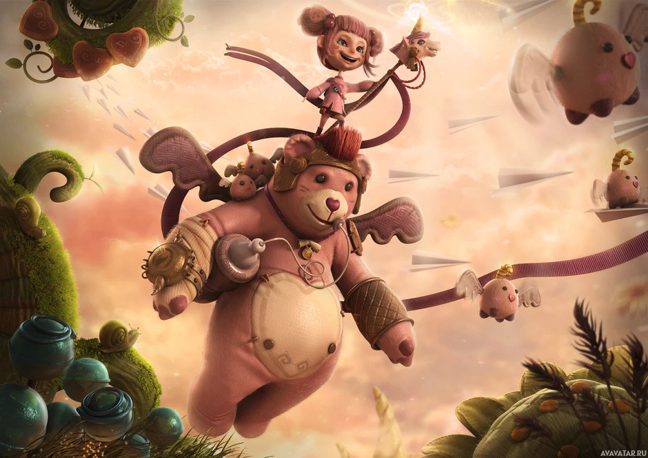 central characters: on the left is a larger bear with wings, carrying a smaller bear on its back. The smaller bear appears to have wings as well and is wearing an outfit that resembles a knight's armor, complete with a helmet. On the right, there is a rabbit holding a sword upright in front of it, standing on what looks like