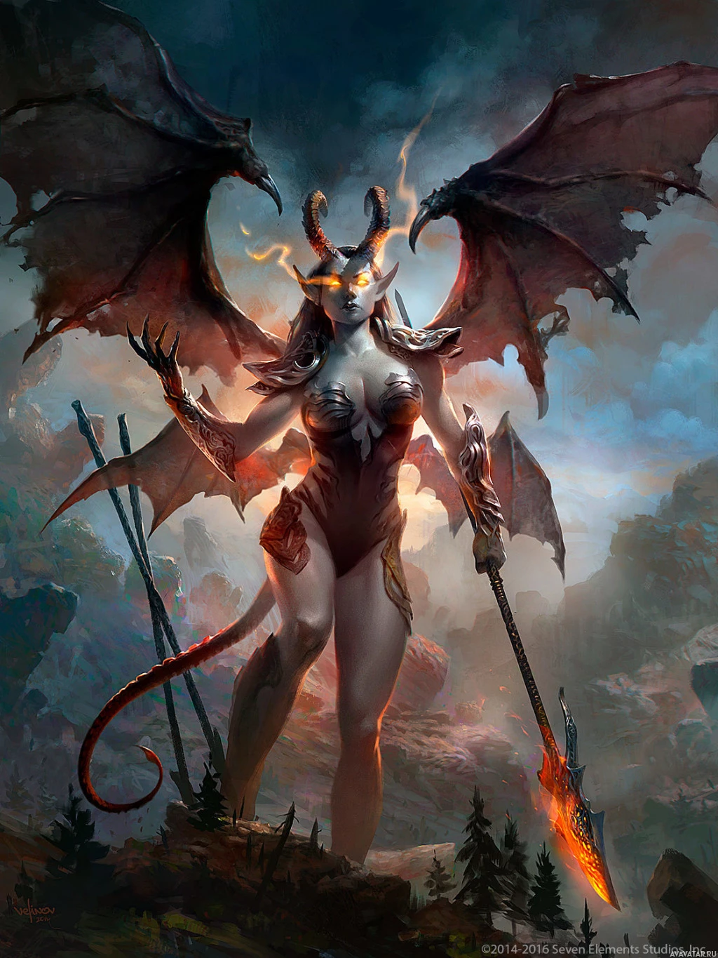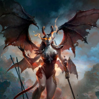 large bat-like wings, horns, and is holding a staff with flames at the top. It appears to be in a commanding or triumphant pose, standing on