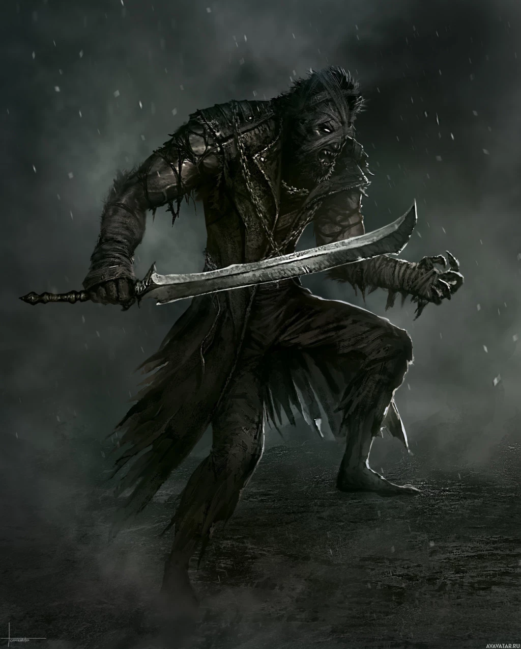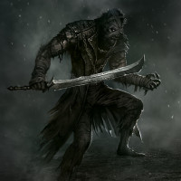 На картинке изображен фантастический персонаж, который кажется воином-оборотнем. Он владеет двумя мечами и имеет сильное, агрессивное выражение лица. Его язык тела говорит о том, что он находится в разгаре битвы или готовится к атаке. Персонаж установлен на темном, бурном фоне с каплями дождя, видимыми в воздухе, добавляя драматический эффект к сцене.