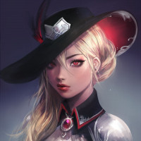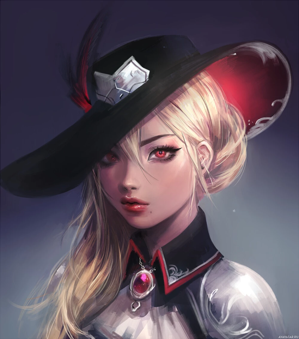 the video game Overwatch. She is wearing a stylish hat and has red eyes, which are characteristics of