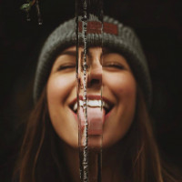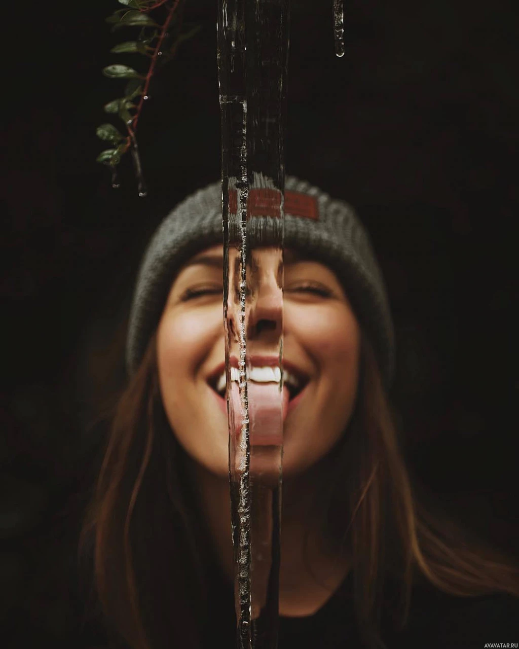 knit cap or hat on their head. The background features what looks like icicles hanging from what might be
