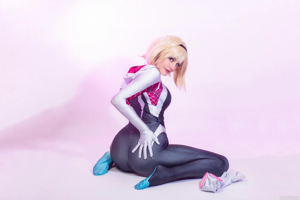 Gwen Stacy, commonly associated with Spider-Man. This costume includes a bodysuit with spider-like patterns and accessories like gloves and boots that are part of the Spider-