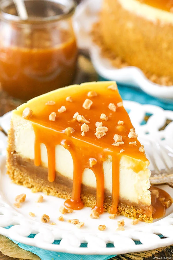 a slice of cheesecake with a caramel topping and chopped nuts, likely pecans. It is placed on a decorative plate, and there appears to be additional