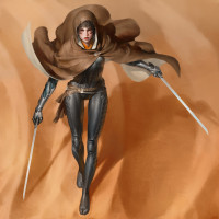 a hooded cloak or jacket over a dark outfit that could include armor components. The background is minimalistic with a sandy texture and a warm lighting atmosphere, suggesting