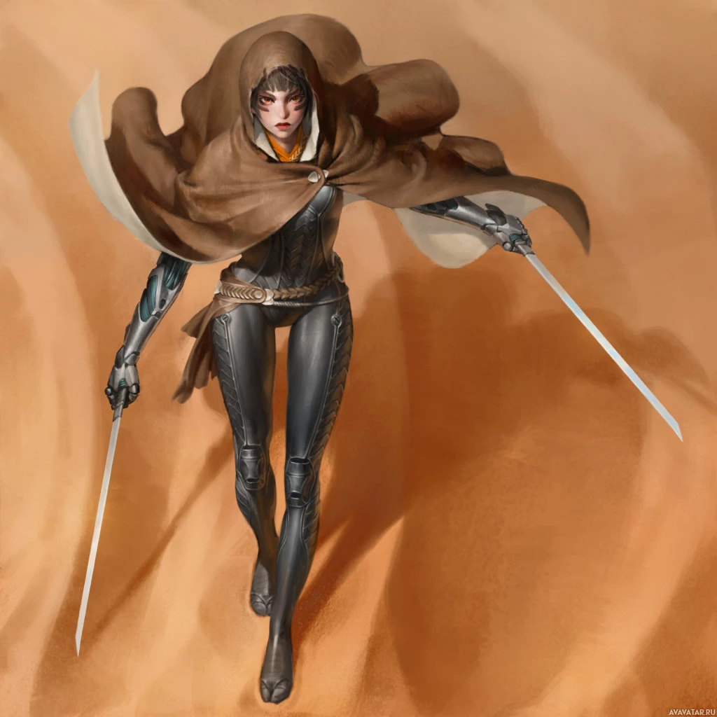 a female character in a dynamic pose, holding two swords crossed in front of her. She appears to be wearing