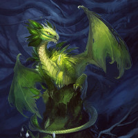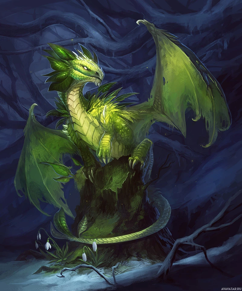 The image depicts a fantasy-themed illustration of a dragon. It has green and white coloring, with intricate details suggesting scales and