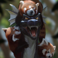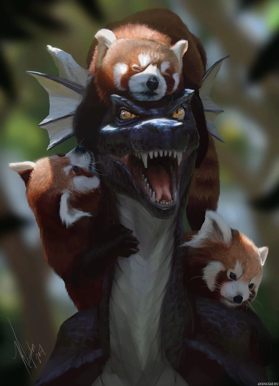 sharp teeth visible, is portrayed in the foreground holding two young red pandas on its back. The red pandas appear to be peering over the edge of the dragon's neck or looking towards it, showing curiosity or playfulness. The background suggests
