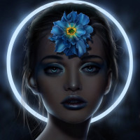 a female figure with a flower, specifically a blue daisy, resting on her forehead. She has long,