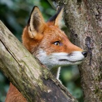 red fox, with its typical reddish-brown fur and pointed ears. The fox is looking towards something in front of it, which might be an object or another animal. There are trees around that suggest this scene could be from