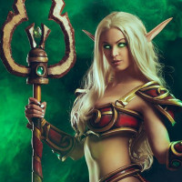 a female character dressed in fantasy-style armor and accessories, reminiscent of the Warcraft video game series. She has