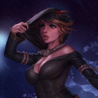 short hair and is holding her hood open as if she's looking up at the sky. The setting seems to be rainy or misty, as suggested by the background that includes water elements and what might be rain or mist falling from above.
