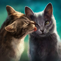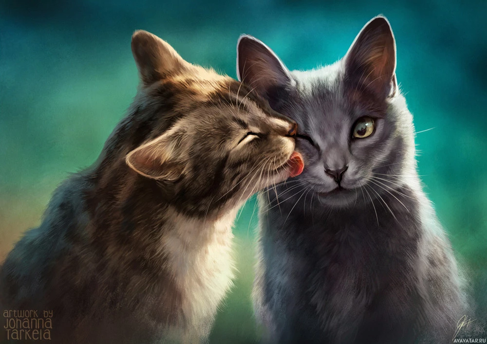 a tabby cat with striped fur and the other is a gray tabby cat. They appear to be interacting affectionately, with one licking or sniffing the face of the other, who has