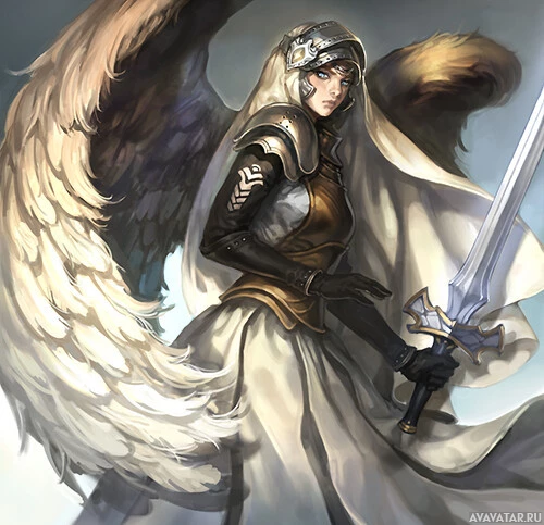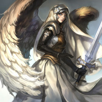 large wings and is adorned with armor, including a breastplate and gauntlets, suggesting a warrior-like role. They are holding a sword in their right hand, which complements the overall depiction of strength and protection. The character's expression is serious, adding to the noble or heroic aspect of their persona. The art style is detailed and realistic, typical of fantasy illustrations.
