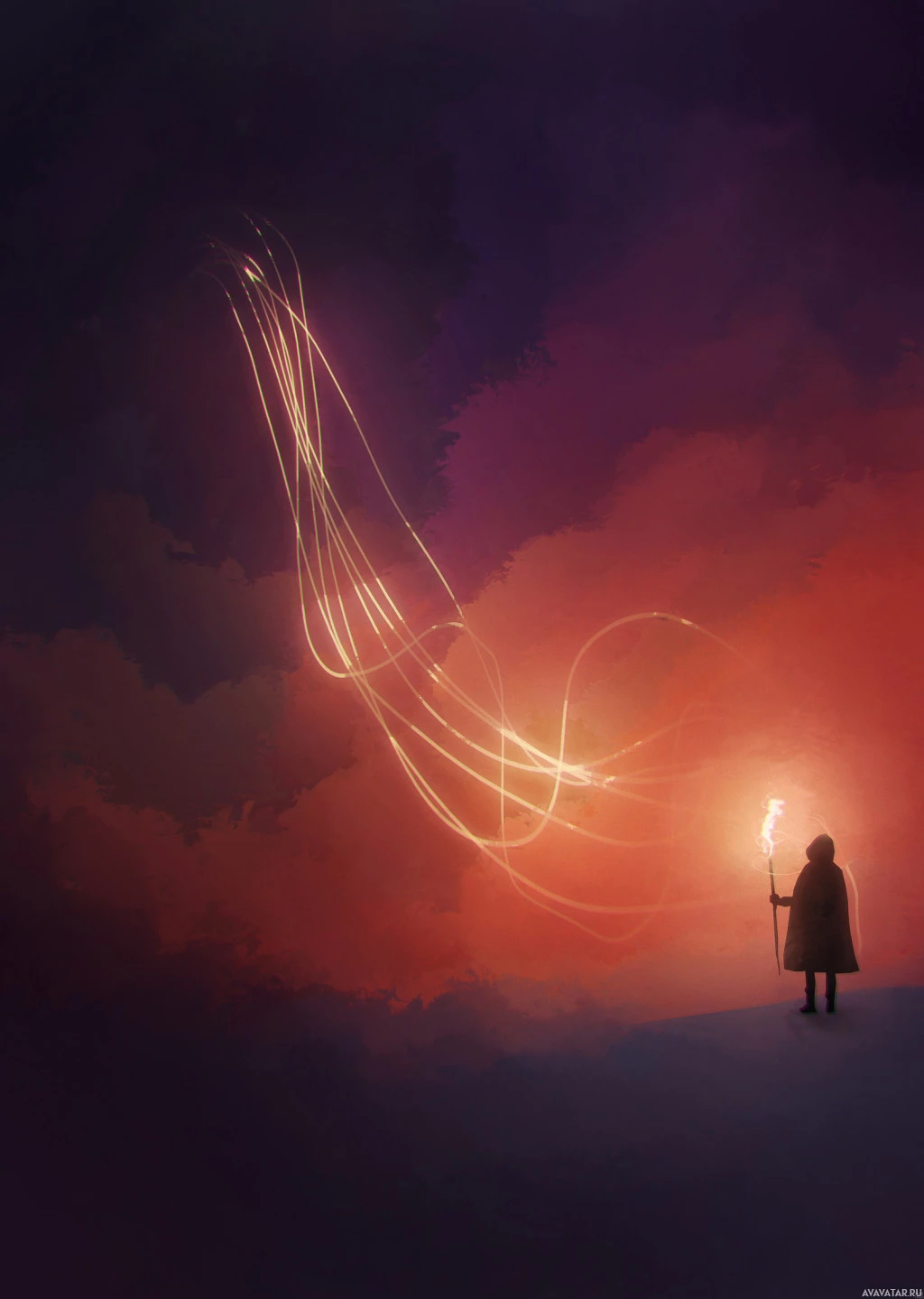 symbolic meaning. The color palette is dominated by purples and blues, which could suggest
