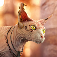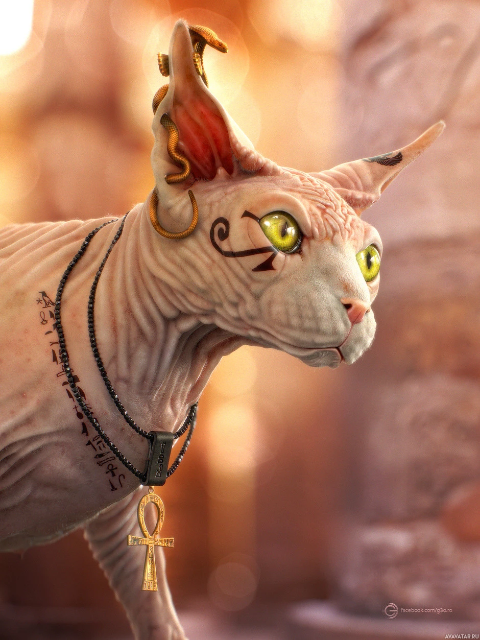 Egyptian symbolism. Additionally, the cat has markings on its face that resemble tattoos or paint, giving it a somewhat human-like appearance. The background suggests