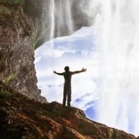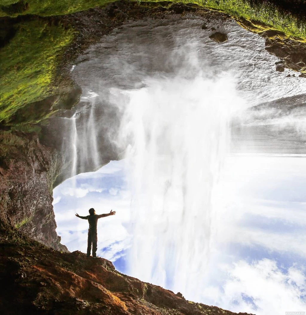 the edge of a waterfall with his arms outstretched, as if embracing nature or possibly posing for a photo. He is positioned in such a way that he appears to be defying gravity due to the angle and perspective of the photo being taken at an upward angle. This creates an illusion that the man is standing on the "floor" of the waterfall, which adds
