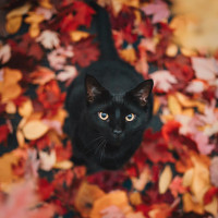 На снимке изображена черная кошка, сидящая в осенней тематике. Кошка смотрит прямо на камеру, и вокруг разбросаны красочные осенние листья, что может свидетельствовать о том, что фотография была сделана в осенний сезон или настроена так, чтобы имитировать ее.