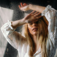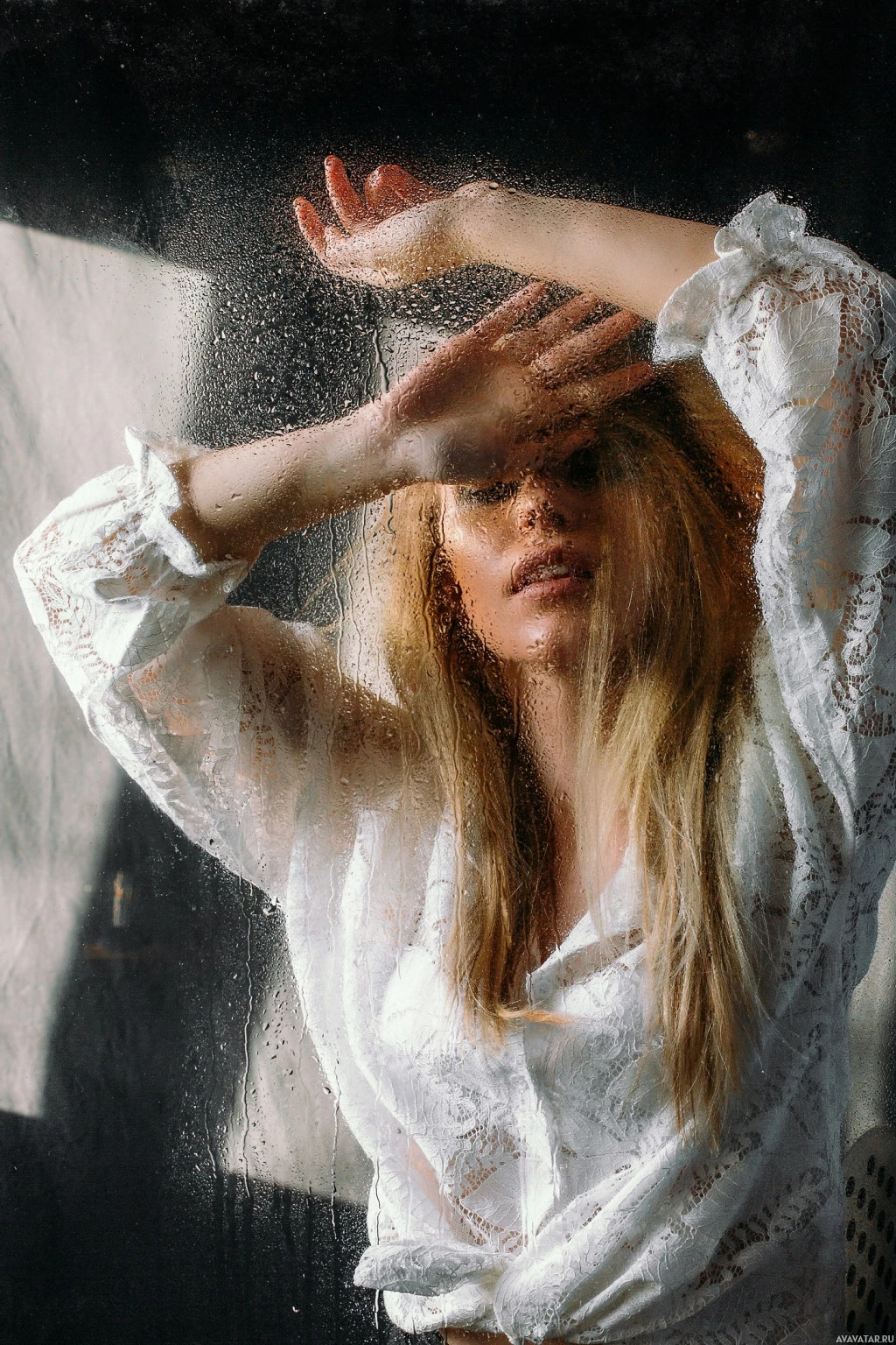 a white top on and seems to be in motion or reacting to an action outside the frame of the image. The background includes what appears to be raindrops or