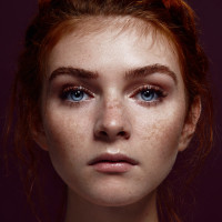 На фото изображена молодая женщина с рыжими волосами. Она смотрит прямо в камеру, и ее выражение кажется нейтральным или слегка созерцательным. Фон темный и не дает много контекста об обстановке.