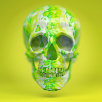 a human skull. It is decorated with a bright green, splash-like pattern that covers the entire skull except for the teeth and the nasal passage. This