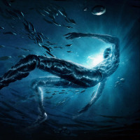dark color against a lighter background, focusing on the shape rather than the details. This artwork conveys the idea of diving or swimming through the water, possibly symbolizing freedom or exploration. The surrounding water contains small bubbles and possibly some fish, adding to