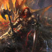 battle scene with fire and destruction around him, suggesting that he might be in the midst of a fierce battle or confrontation. The character is depicted as having a muscular build,