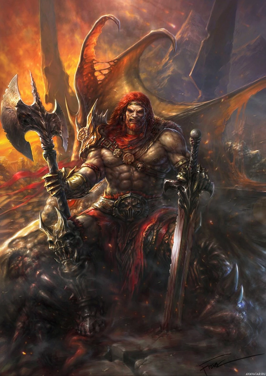 a large axe in one hand and a sword in the other. The setting seems to be a chaotic