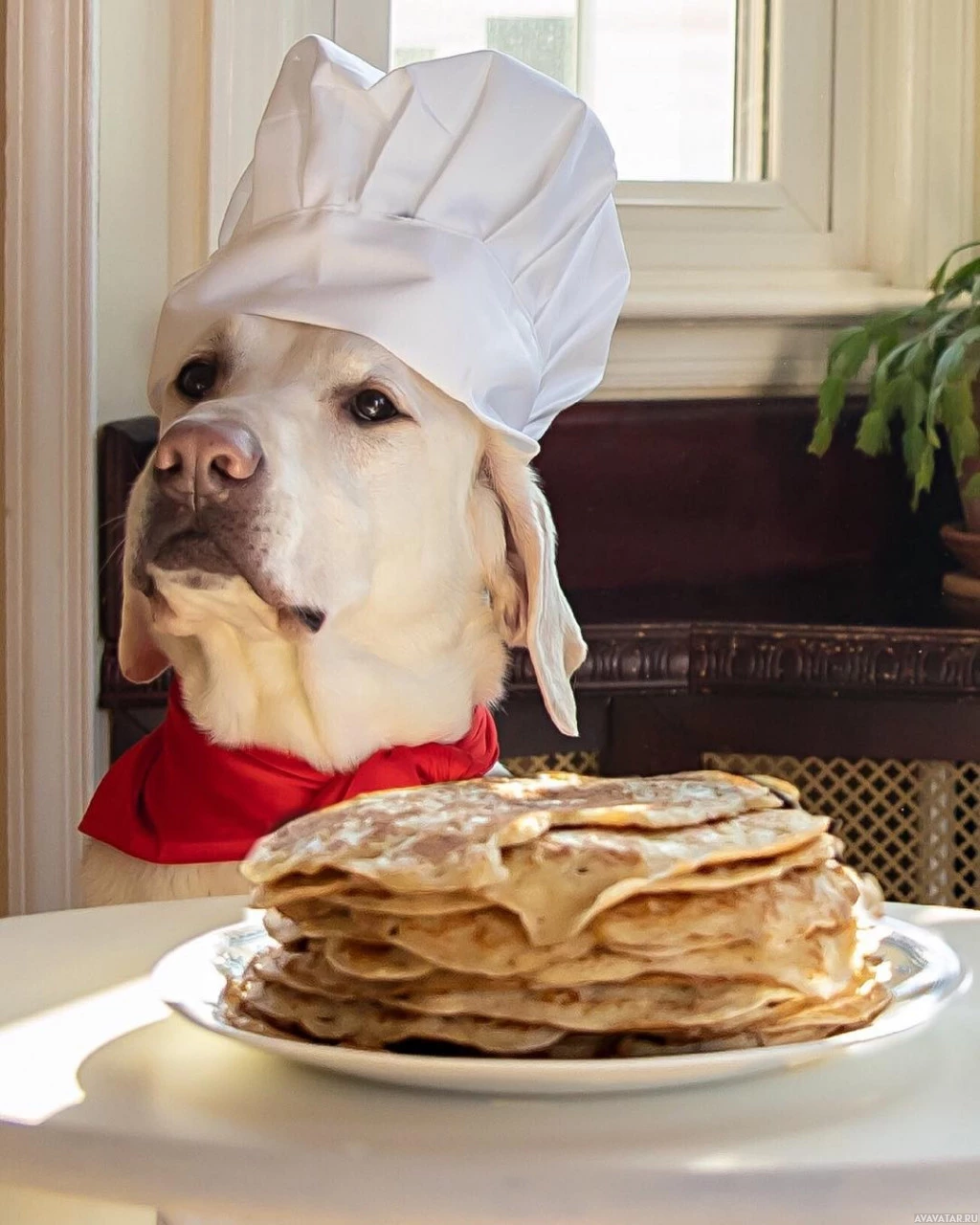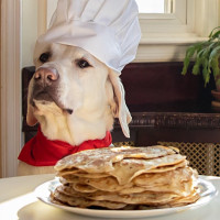 На картинке изображена собака в шляпе шеф-повара и сидящая перед тарелкой с тем, что кажется уложенными блинами. Собака пристально смотрит в камеру, и на снимке не видно людей.