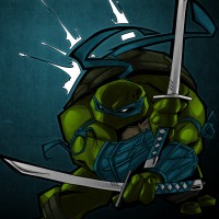 iconic pose with two swords crossed behind him, suggesting that he is ready for combat. The character is drawn with his distinctive green color and other features like a shell on his back, which are characteristic of this particular